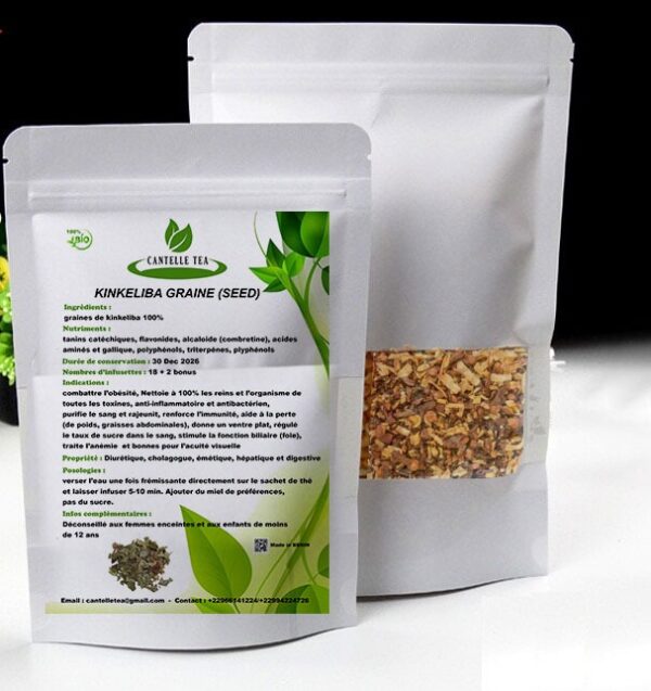 Découvrez notre thé Kinkeliba Graine (Seed), un thé 100% naturel et pur à base de graines de kinkeliba. Ses propriétés anti-inflammatoires, antibactériennes et antioxydantes aident à purifier le sang, nettoyer les reins et l’organisme de toutes les toxines et renforcer l’immunité. De plus, il régule le taux de sucre dans le sang, traite l’anémie et est bon pour l’acuité visuelle. Enfin, il aide à la perte de poids, donne un ventre plat et stimule la fonction biliaire. Avec 18 infusettes plus 2 bonus, notre thé est le choix parfait pour une vie saine et équilibrée. Veuillez noter qu’il est déconseillé aux femmes enceintes et aux enfants de moins de 12 ans.