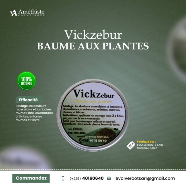 Le baume aux plantes Vickzebur de la gamme Amethiste Cosmetics de la société EVOLVE ROOTS est un produit formulé pour valoriser les plantes africaines. Cette préparation est conçue à partir d’huile essentielle de menthe poivrée, d’extraits de plantes tels que Anonnas Senegalensis, Aframomum Melegueta et Syzygium Aromaticum. Le baume a pour but de remplacer ou de compléter les formes traditionnelles utilisées en Afrique pour traiter divers maux tels que le rhume, la fièvre, les douleurs musculaires, lombaires ou articulaires.